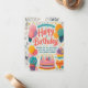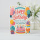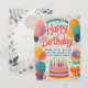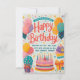 La tarjeta presenta un diseño colorido y festivo con la frase "Feliz cumpleaños" que se muestra de forma destacada en el centro. Está adornada con globos, pastelitos, una torta de cumpleaños con velas y una caja de regalo. El fondo incluye estrellas y puntos, lo que añade un ambiente de celebración.