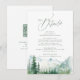 Bosque de pino verde exuberante en acuarela y montaña brumosa con letra moderna salvia, elegante y romántico, tarjetas de gran detalle con código QR para boda rústica boho y boda de destino en el bosque de montaña en primavera y verano.
