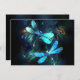 Dos libélulas transparentes, luminosas, turquesas, dibujadas de forma artística sobre el fondo nocturno con algas lacustres luminosas y luciérnagas. Flauta de dragón resplandeciente.