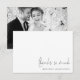 Elegante Script Boda de fotografías en blanco y negro Gracias. Con mucho espacio en blanco para que puedas escribir a mano tu propio mensaje especial al recibirlo. Con un elegante estilo de escritura a mano para Gracias Mucha y personalizar fácilmente sus nombres y reemplazar la imagen de ejemplo en la parte posterior por la suya propia. TIP esta foto tiene aplicado un filtro en blanco y negro, para desactivarla y tener la imagen en color, haga clic en el botón de la herramienta de edición en diseño, seleccione filtros en el panel derecho y elija ninguno.