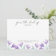 Una bonita tarjeta con una hermosa frontera inferior de flores de lila en acuarela con hojas verdes, con "de la mesa de" en fuente de estilo caligráfico moderno en negro, y personalizada con tu nombre. Se añade el popular versículo bíblico "El Señor te bendiga y te guarde" Números 6:24, que puedes editar. Esta tarjeta es perfecta para enviar una nota de aliento, o ¿por qué no comprar un conjunto como regalo para tu madre, amiga, esposa del pastor o cualquier otro adicto a la papelería?