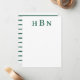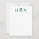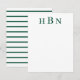 Diseño de tarjeta de nota plana personalizada atemporal y elegante que presenta letras verdes de cazador profundas que se pueden personalizar con las iniciales del primer, último y segundo nombre en tipo serif clásico. El espacio para su nota manuscrita está incluido y la parte posterior de la tarjeta presenta un patrón atractivo de rayas horizontales verdes y blancas.