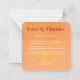 Expresa tu agradecimiento con la tarjeta de agradecimiento de boda con monograma Mini Bold Orange Sunset, una pequeña tarjeta con un gran impacto. Con un vibrante diseño de acuarela de puesta de sol naranja y un monograma personalizado, refleja perfectamente una estética de boda cálida y moderna. Su tamaño compacto la hace ideal para mensajes manuscritos y sinceros, manteniendo un aspecto audaz y elegante. Un hermoso toque final para agradecer a tus invitados por celebrar tu día especial.