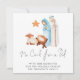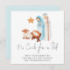 No Hay Cuna Para Los Navidades De Natividad De Cama. Una bella escena de la Natividad simple pintada, con María, José y el bebé Jesús en un pesebre, y la letra No Crib For a Bed en un elegante guión sobre un fondo blanco para un ambiente contemporáneo. Personaliza fácilmente tu saludo y nombres en la parte inferior. El fondo azul de coordinación del otro lado puede cambiarse a otro color si se prefiere a través de la opción personalizar adicional.