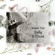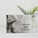 Envíe un cálido mensaje de agradecimiento y agradecimiento a sus invitados por los regalos recibidos después de un fiesta casual y elegante de un granero de compromiso, una ducha de novia o una ceremonia de matrimonio y recepción con la entrañable Llanura de Bodas de Camarera y Girasoles. Estas encantadoras notas de agradecimiento a la moda rústica personalizado muestran una pintoresca fotografía de una granja en blanco y negro de una novia con un vestido de boda de encaje blanco y botas de vaquero occidentales de cuero que llevan un ramo de flores de girasol inclinadas contra una valla de alambre de madera.