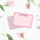 Una tarjeta de agradecimiento / nota con estilo que incluye un banner de monograma personalizado, colores rosa, morado y blanco, lunares y un espacio enmarcado para un mensaje manuscrito.