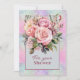 Un bonito ramo de flores rosas rosas sobre un fondo multicolor salpicado de puntos y enmarcado en verde y rosa. A la novia le encantará esta tarjeta de bonito en su ducha de boda.