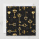 Patrón incomparable de llaves antiguas, doradas y de silueta sobre fondo negro.