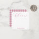 Personalized stationery enclosure notecard with a pink gingham pattern in notes of dark deep and vibrant rose pink bubble gum and white with the sentimental words "Cheers". Tuck it into a flower bouquet or meaningful gift. These minimal flower shop inspired enclosure cards bring a retro kitchen vibe to your most thoughtful moments.