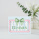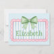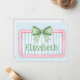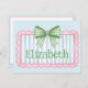 This cute note card features a pink frame with blue and white stripes and topped with a preppy green and white gingham plaid bow. Personalize with your choice of name or special text.