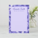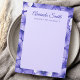 Blank stationery note cards featuring your name in an elegant script font with custom text below. Around the edge and on the back is a purple flower pattern.