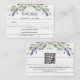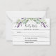 Madera blanca rústica como fondo, texto negro. Decorado con flores de lavanda y vegetación eucaliptica. Personalice y agregue una respuesta por fecha. Atrás: agregue la dirección URL del sitio boda al código QR y un texto.