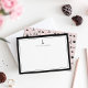Nuestras tarjetas planas de diseño de papelería personalizadas inspiradas en la moda parisina cuentan con un borde negro clásico, un minúsculo ilustracion de la torre Eiffel negro, y su nombre, monograma o elección de personalización. Las tarjetas se adaptan a nuestro modelo de París romántico, con pájaros pequeños, croissants, macarons, rosas, tazas de café y la torre Eiffel sobre un fondo rosa pálido y rosa.