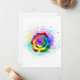 Rosa grande y floreciente con pétalos de arco iris sobre fondo blanco, pintado con salpicaduras de pintura colorida y brillante. 3.ª