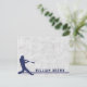 Tarjeta personalizada con la silueta azul oscuro de un jugador de béisbol bateando sobre un fondo de pelota desgastada. En la parte inferior hay un borde con dos franjas azules y texto personalizable en una fuente deportiva de jersey universitario azul oscuro.