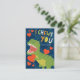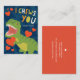 Tarjeta El día de San Valentín para niños con un ilustracion de una T-rex verde sosteniendo un corazón rojo sobre un fondo azul con las palabras "te elijo". Diseño de Shelby Allison.