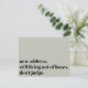 En esta tarjeta en tono de burla, se usó un tipo de letra negrita para representar "nueva dirección. todavía viviendo de cajas. no juzguen." en el frente. Detalles actualizados, junto con un agradable "¡Quédate en contacto!" aparecen en la parte de atrás. Todos los tipos de letra, colores y texto se pueden cambiar para adaptarlos a sus propias necesidades.