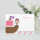 Esta fiesta de cumpleaños de chicas dulces ¡Gracias tarjeta plana tiene un tema pirata rosa y morado! Hay un pirata de pelo castaño navegando en su barco pirata parado al lado de un loro a la izquierda. En la parte inferior, encontrarás unas rayas rosas, blancas, taupanas y acuáticas a la última. A la derecha, gracias está escrito. Algunos elementos de diseño de STOCKBERRY STUDIO