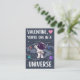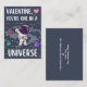 Esta genial tarjeta El día de San Valentín presenta a un astronauta en el espacio con las palabras "Valentine, eres uno en un universo". Estrellas, la Tierra y otros tres planetas están en el fondo, y un corazón rosado flota en la esquina superior derecha. Esta tarjeta es excelente para los niños que necesitan traer San Valentín al aula. La parte posterior incluye texto de personalizable en el que puede agregar el nombre de su hijo. Consulte la colección para ver otras cuatro tarjetas de clase con temas espaciales.