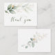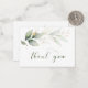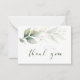 Elegante tarjeta de agradecimiento con follaje verde y dorado en estilo acuarela y efecto dorado confetti.