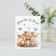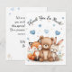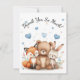 Complete your woodland-themed celebration with this adorable thank you card featuring a sweet bear, fox, and bunny surrounded by soft pastel watercolor florals and floating blue hearts.
