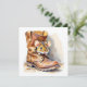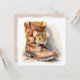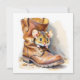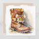 Un lindo ilustracion acuarela con un ratón mirando desde una vieja bota marrón. Tarjeta en blanco.