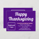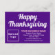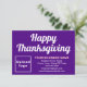 ¡Feliz Día de Acción de Gracias! Un feriado para celebrar y agradecer por las bendiciones que recibimos. También es una de las vacaciones para promocionar su negocio. Tarjeta de saludo plana de tamaño reducido que puede personalizar poner su marca de negocios y con el saludo de Acción de Gracias. Personalizar y úselo para saludar a sus clientes o clientes este Día de Acción de Gracias y como material de marketing para promocionar su negocio o promocionar su marca. También puede utilizarlo como accesorio del material de embalaje de su producto. Tarjeta de saludo de personalizable que puede utilizar para crear conciencia de marca. Los colores de diseño son textos en rosa y blanco sobre fondo morado. Para personalizar de esta tarjeta de saludo, sube el logotipo de tu empresa, escribe tu nombre de negocio, dirección, número de teléfono, correo electrónico y sitio web o tu página de red social comercial. Compruebe la apariencia después de cargar el logotipo y escribir textos. Si la apariencia le resulta agradable, puede realizar su pedido ahora. Si necesita cambiar el tamaño y mover el logotipo y los textos para que encajen en esta tarjeta de felicitación o en otros tamaños que elija, por favor cambie la herramienta de diseño. También puede cambiar el color de fondo, el color de fuente y el estilo de fuente en la herramienta de diseño. ¡Feliz Día de Acción de Gracias! Te deseo más ventas esta fiesta.