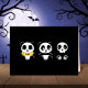 Dos pequeños panda que se sientan en la oscuridad con un esqueleto minúsculo. Una panda está llevando una camiseta amarilla con la palabra "meh" en ella.