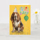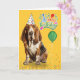 El amarillo audaz y alegre muestra los confeti multicolores, globo verde y texto de cumpleaños colorido en esta tarjeta con un lindo perro de Basset Hound usando un gorra de la fiesta de cumpleaños.