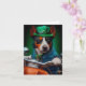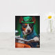 Un amigo peludo detrás del manillar de una bicicleta verde brillante, vestido con un traje verde de San Patricio que llama la atención. El perro está vestido con un conjunto festivo, completo con una corbata de lazo verde y un sombrero a juego que se sienta cómodamente sobre su cabeza. El traje presenta diseños intrincados de tréboles y duendes, lo que deja claro que este perro está listo para celebrar el día de San Patricio con estilo.