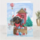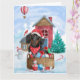 Tarjeta Perro Dachshund en la casa de Navidad en la nieve
