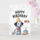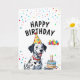 Un feliz dálmata sosteniendo una torta de cumpleaños, añadiendo diversión a cualquier tema de cumpleaños.