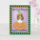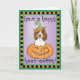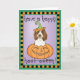 Envíe los saludos de Halloween con esta tarjeta de un perrito lindo del saltador en una Jack-o-Linterna sonriente. Grande para los niños de todas las edades que aman perros de aguas de saltador inglés y Halloween. ¡Tenga un Aullido-oween feliz!