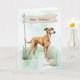 El elegante Greyhound se alza en el césped con un aspecto fino pero relajado, con un marco largo y elegante que contrasta con el suave fondo acuático. Una pancarta que se balancea por encima y un hueso juguetón por debajo le dan un toque festivo a esta carta a alguien que es elegante, gentil y lleno de fuerza tranquila.