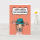 Un diseño divertido y llamativo de un perro de Greyhound italiano vestido con un gorra azul verde azulado de estilo vintage, con un color de fondo de su elección que tiene una burbuja de habla con bordes de vieiras con las palabras, ¡feliz cumpleaños de un buen espécimen! En el interior se puede leer: ¡puedes seguir madurando como un buen vino! Ideal para hombres y mujeres amantes del perro.