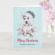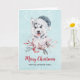 Tarjeta de Navidad con una pintura acuarela caprichosa y linda de un perro husky que lleva un sombrero azul de Santa.