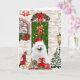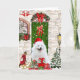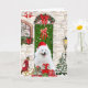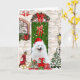 Perro Spitz Navidad sentado fuera de la casa decorada con corona de Navidad, el árbol de Navidad es una excelente idea de regalo de Navidad para los amantes de los perros.