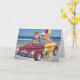 Dos laboratorios amarillos y un perro del ganado en traje hawaiano en un Woodie. Un bulldog en pañuelo hawaiano está con ellos. Usted puede modificar el texto para requisitos particulares. El woodie, el bulldog y el océano eran todo imágenes separadas de publicdomainpictures.net.