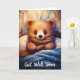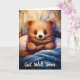 El oso bebé lindo está enfermo en la cama con una bufanda y un saludo "súbete pronto". Tienes la opción de mantener el saludo en la parte trasera o personalizar el saludo con tu propio mensaje.