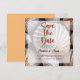 Tarjeta Personalizada de Guardar la Fecha con Tema de Conchas Marinas. Puedes personalizar los textos en este diseño.