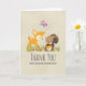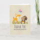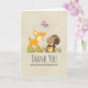 Gracias tarjeta de felicitación con un lindo ilustracion con un ciervo bebé y una pequeña ardilla sosteniendo una bellota y una mariposa volando sobre sus cabezas. Estas adorables criaturas de los bosques sobre el césped con algunos hongos extravagantes a sus pies. El fondo tiene una mirada de papel kraft marrón.