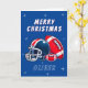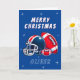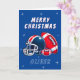 Tarjeta de Navidad Merry al Personalizado de Cascos de la Bola de Fútbol. Navidades de fútbol divertidos y modernos. Con un atrevido ilustracion personalizado de fútbol y casco de colores azul y rojo. Añade tu nombre.