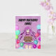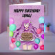 A joyful anime-inspired scene shows a fashionable teenage girl with long, flowing purple hair presenting a rich chocolate birthday cake topped with glowing candles. Soft pastel balloons float around her, creating a festive frame filled with color and light. With its happy energy, vibrant details, and playful style, this birthday card is perfect for a teen who enjoys anime and fun, sweet artwork. This is an original Daphsam artwork, and adding their name makes the moment even more memorable and personal.