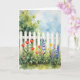A white picket fence with flowers adorn this card. Text inside can be changed. Image is AI-generated by IveyCottage.