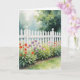 A white picket fence with flowers adorn this card. Text inside can be changed. Image is AI-generated by IveyCottage.