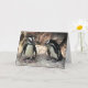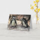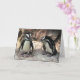 Esta tarjeta de nota ofrece dos pingüinos africanos adorables que se colocan en una repisa rocosa. Son los pájaros acuáticos, flightless cuyas alas tienen aletas convertidas. Cada uno tiene una raya negra y puntos negros en el pecho. El modelo de puntos es único para cada pingüino, apenas como huellas dactilares humanas. Tienen glándulas rosadas sobre sus ojos y pies rosados y negros.