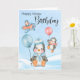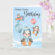Pingüinos dulces con globos y avión para la tarjeta de cumpleaños de invierno. La tarjeta de cumpleaños específica de temporada es perfecta para el invierno. Diseño © 2021 Julia Bryant.