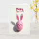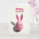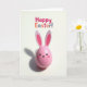 This card shows a simple still-life scene with a single bunny-like egg character centered near the bottom, set against a bright white background 🐰. The main figure is a soft pink egg shape with long upright ears, each ear showing a darker rose inner area. Its face is minimal with small dark oval eyes, a tiny inverted V nose, and two round rosy cheek spots that give it a sweet, friendly look, like it’s quietly leaning in to greet someone. Above the character, a seasonal greeting is placed in the open space, with words arranged in mixed colors including hot pink, coral, and deep gray. The lettering sits high and roomy, leaving plenty of white space between the text and the character for an airy feel 🌷. Light falls from the right, creating a gentle but noticeable shadow stretching to the left, which makes the figure feel grounded and close. The surface looks smooth and matte, and the pink bunny-egg stands out crisply against the white field with its left-cast shadow.