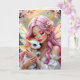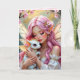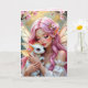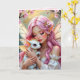 A pretty pink anime elven fairy holding her cute white baby dragon birthday card.