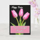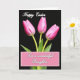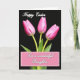 The front design shows three pink flower buds rising on slender green stems from a shared base, set against a deep black background that makes the petals look softly lit. Each bud is still closed, with gentle blends of fuchsia and blush and fine veins that suggest a velvety surface. The stems curve toward one another as if leaning in, creating a quiet, affectionate closeness like friends posing side by side. Near the top, a seasonal greeting sits centered in bright white, written in flowing cursive-style lettering that stands out clearly in the dark space. Near the bottom, a rectangular text area is outlined by a soft pink-and-white gingham border, holding a short dedication in matching cursive-style text. The layout leaves plenty of breathing room around the flowers, and a small 🌷 or 🐇 accent can sit comfortably near the message without crowding the design. The black background stays smooth and uninterrupted, while the petal edges catch tiny highlights that trace the tips of each bud.